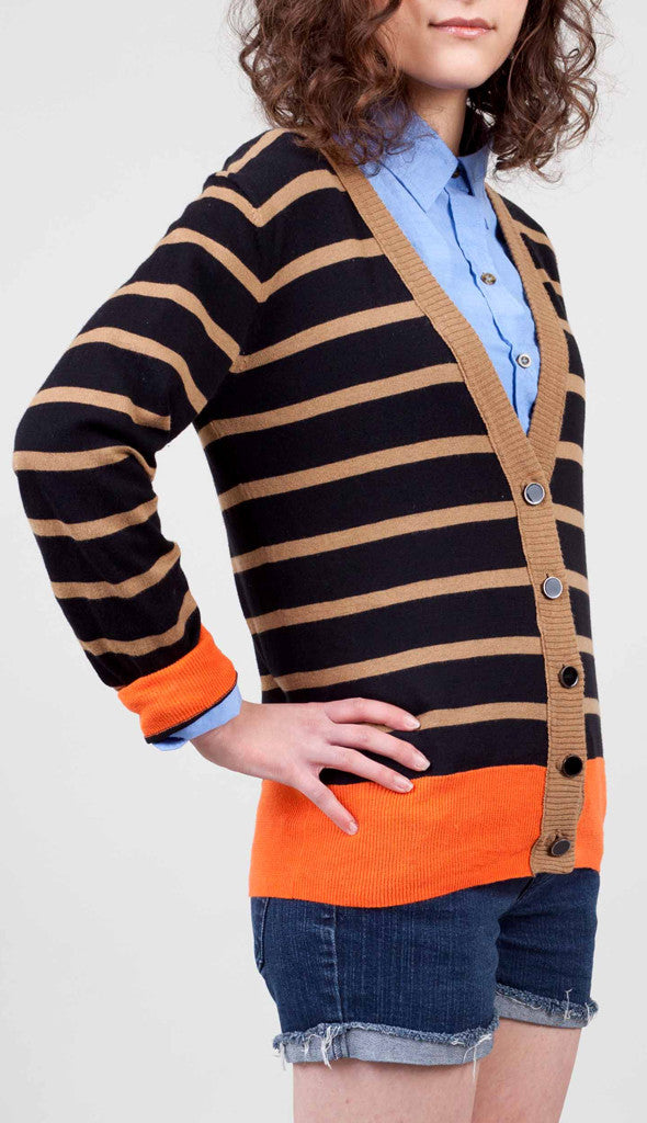 Long cardigan in black and camel stripes with blocks of orange at cuffs and hem. V-neck with black enameled buttons.