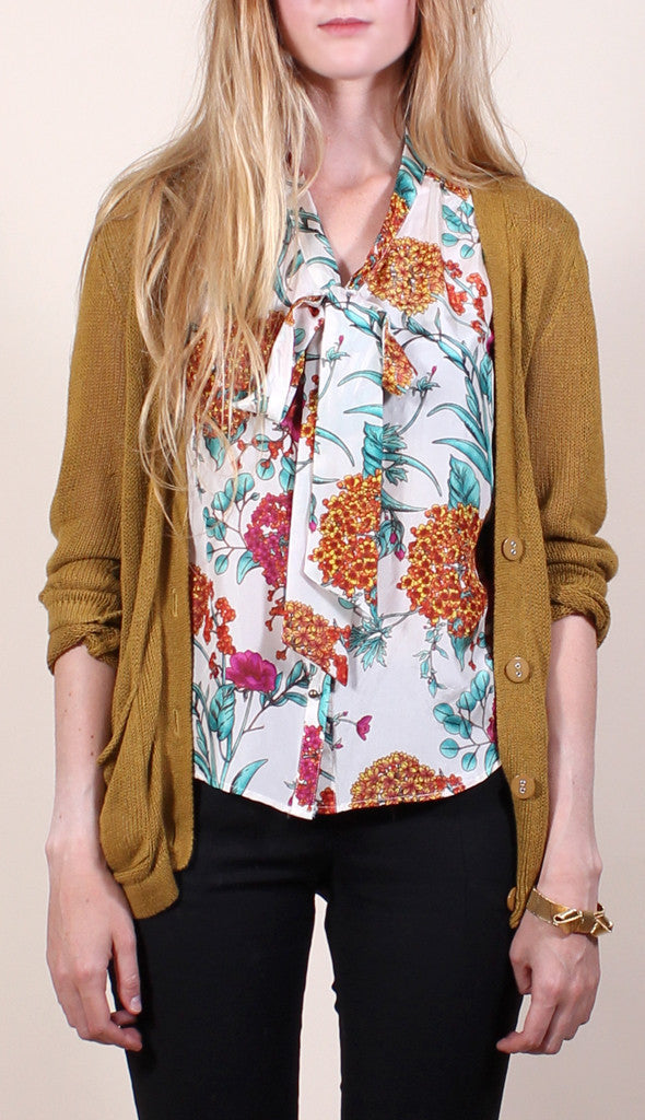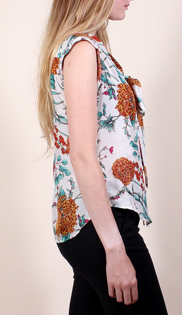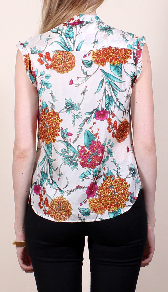 Sleeveless silk blouse printed with a floral motif. Features brass buttons down front and a tie at the v-neckline.