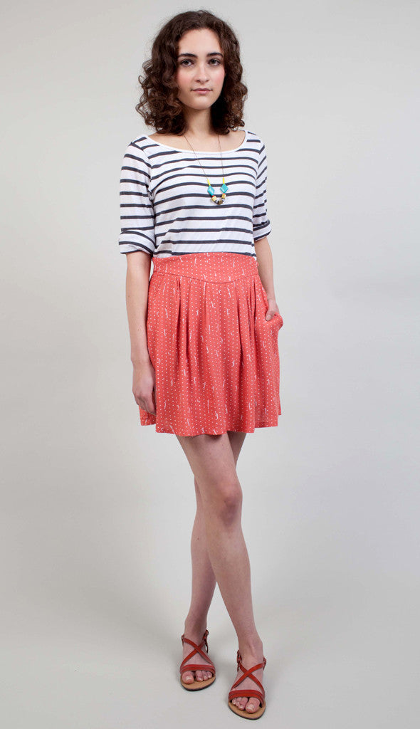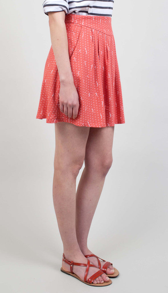 Many Belles DownA sweet and flirty high waisted skirt by Many Belles Down in a summery vintage-inspired coral print. Features banded waist, hidden side pockets and back zip closure. Unlined, fits true to size.