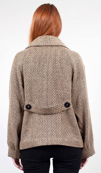 Contrasting basket weave jacket with raglan sleeves, front pockets, pleats on the sleeves, button details on the front and on the back placket.