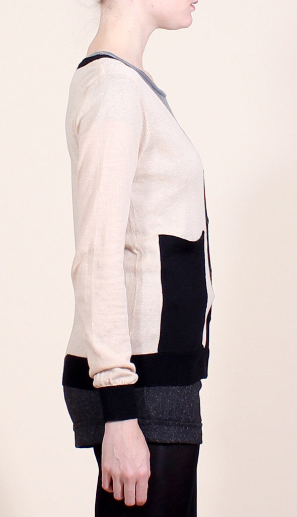 Light long-sleeve cardigan with a v-neckline in cream with deep patch pockets in the front in contrasting black. Buttons down the front. Unlined.