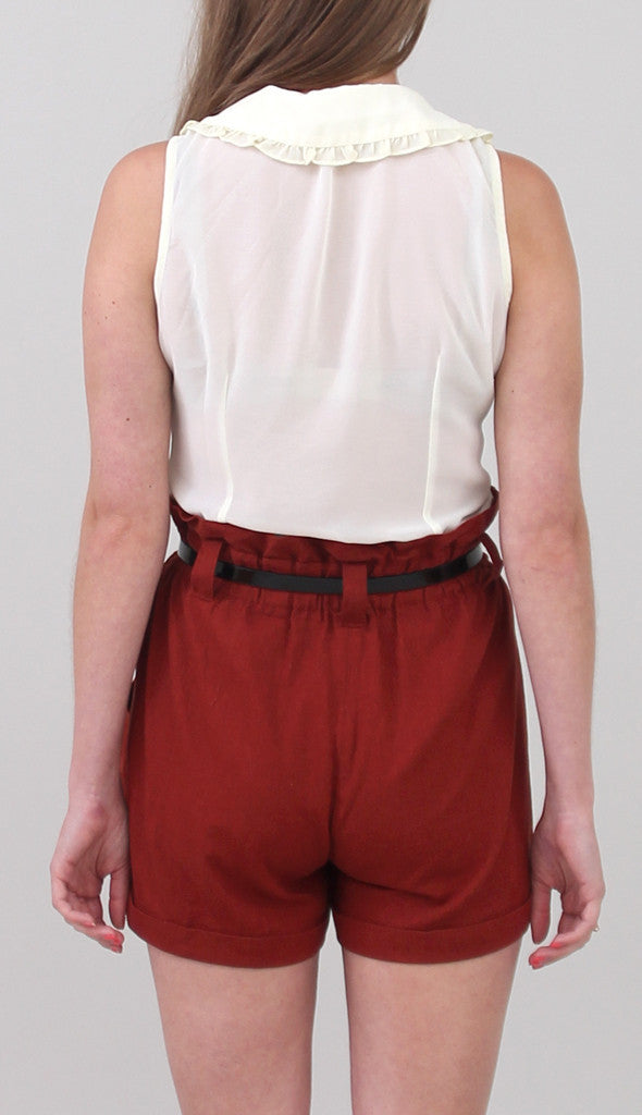 ImportedButton down blouse with a sweet peter pan collar trimmed in ruffles and embellished with a detachable paisley-printed neck tie. Top is semi-sheer, with a high-low hem and gold buttons down the front. Unlined.