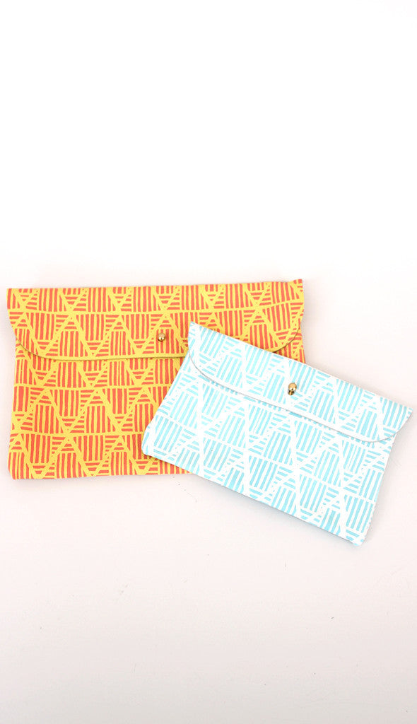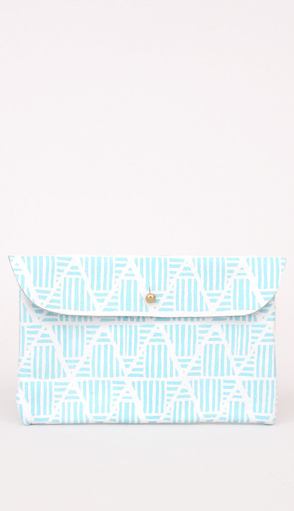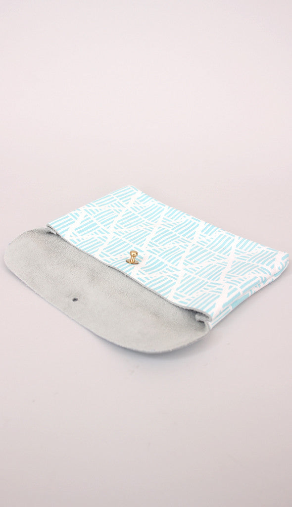 FalconwrightHandmade white leather wallet pouch from Falconwright screenprinted with blue pyramids. Unlined suede interior, tab button closure.