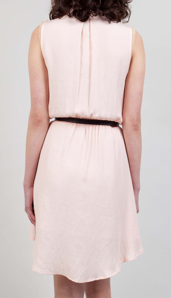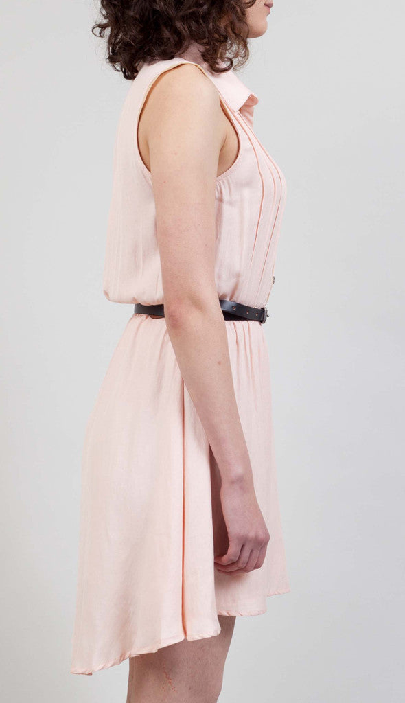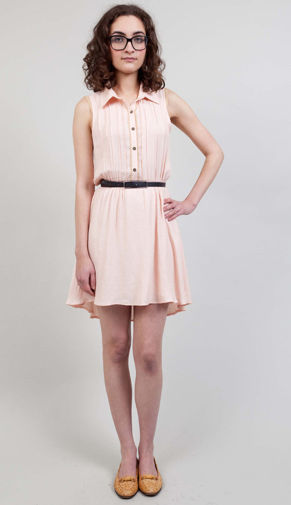 Lucca CoutureA feminine shirt dress with a modern twist. Features button front with pleating along bodice, fishtail hemline and nude trim at sleeves and button placket. Cinched elastic waist for a comfy fit - belt not included.