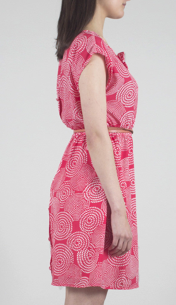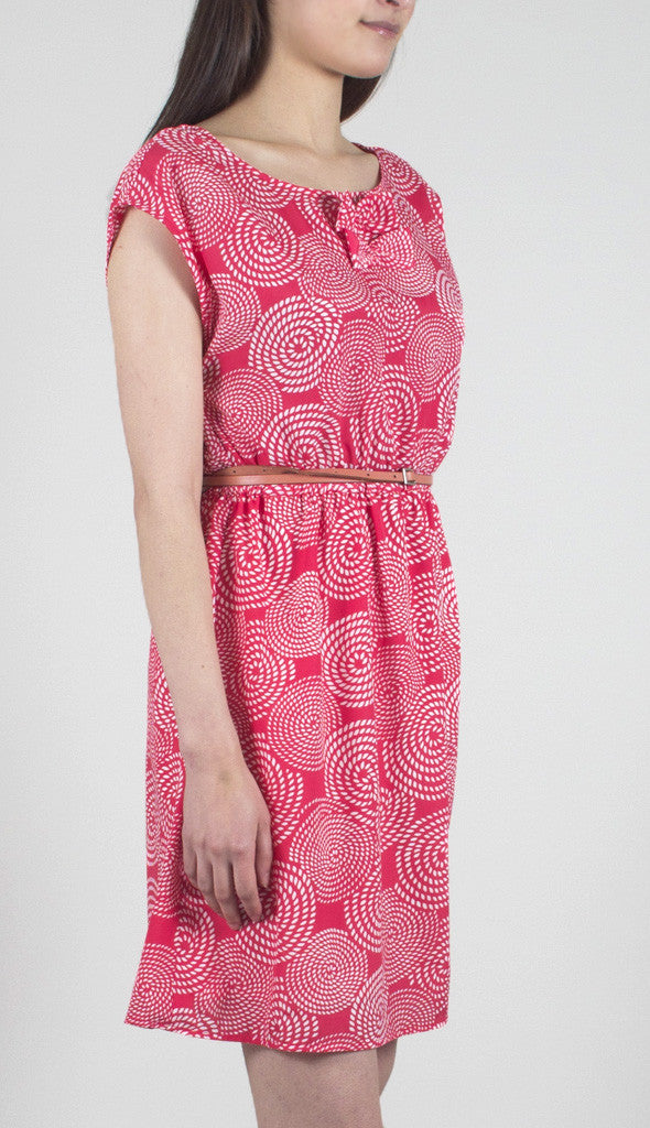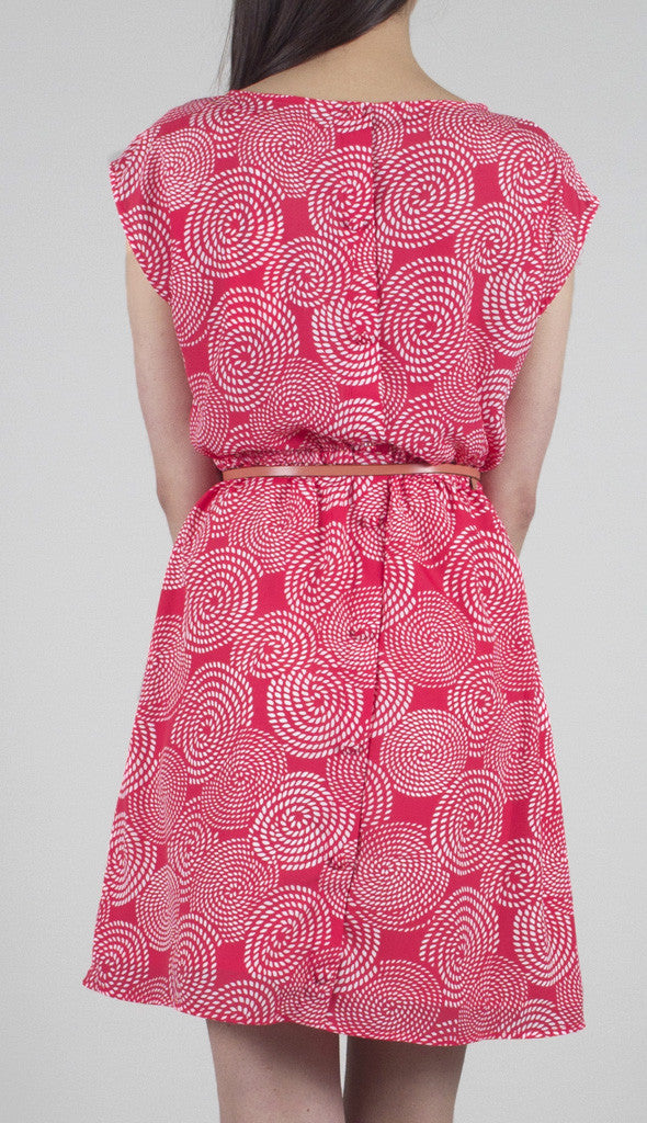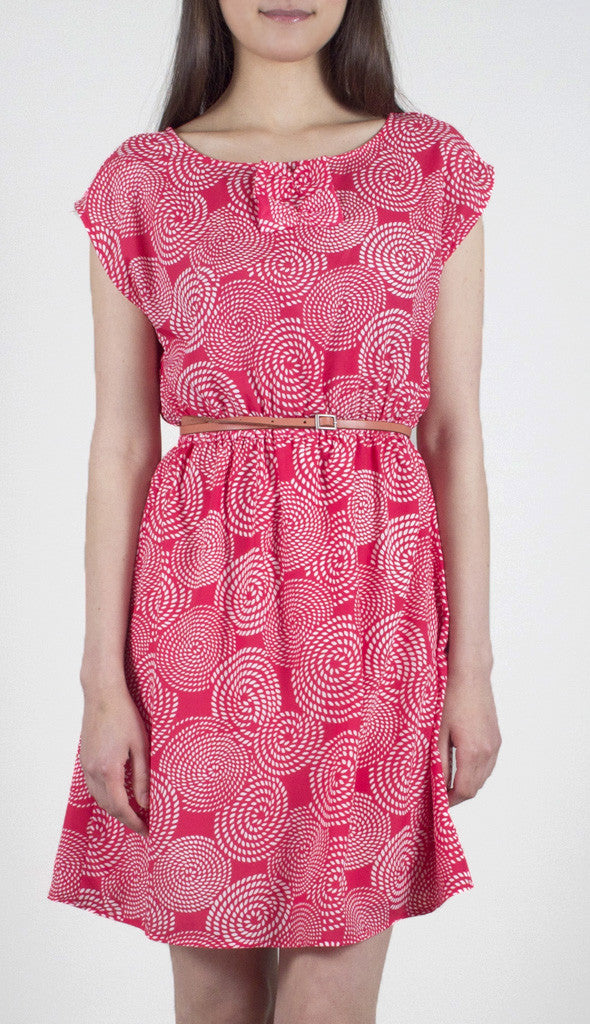 TulleVintage-inspired dress in a spiraling rope print, features two bows at the neck and covered buttons all the way down the back. The fitted waist is cinched with elastic for an easy fit. Lined skirt. Additional button included.