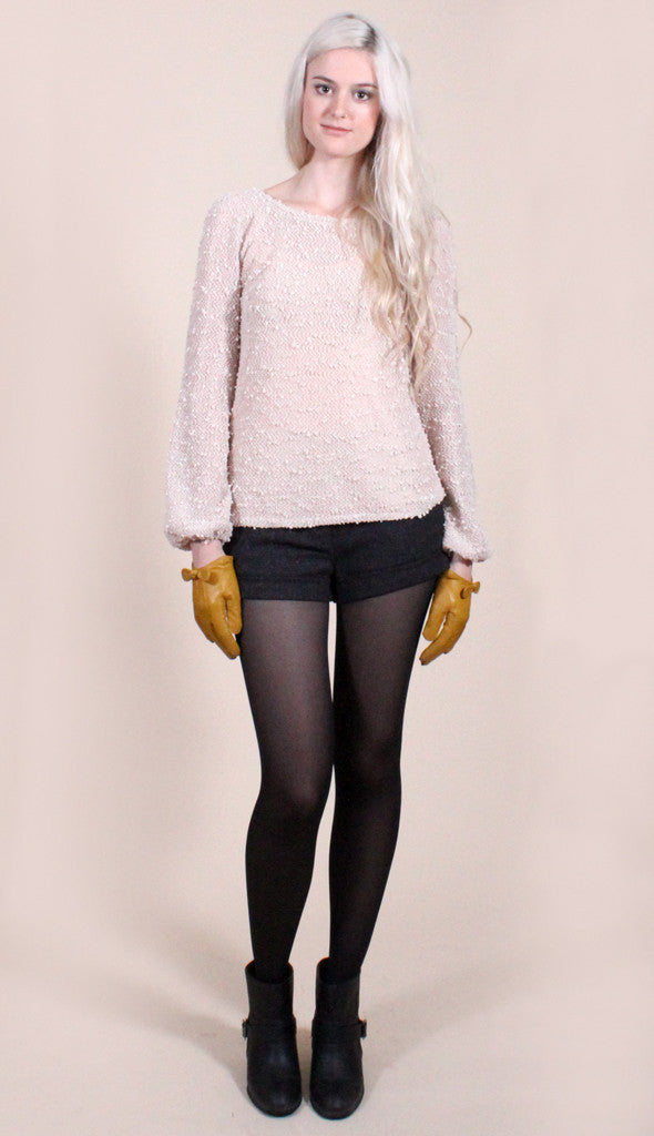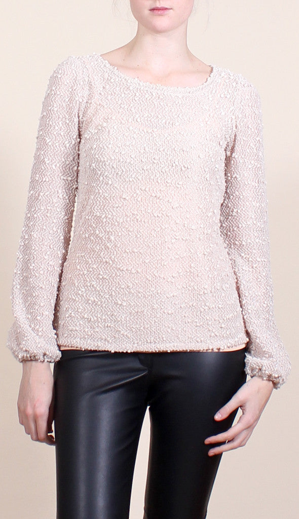 Loose fitting textured sweater with puff sleeves and a scoop neckline. Slightly sheer, unlined.