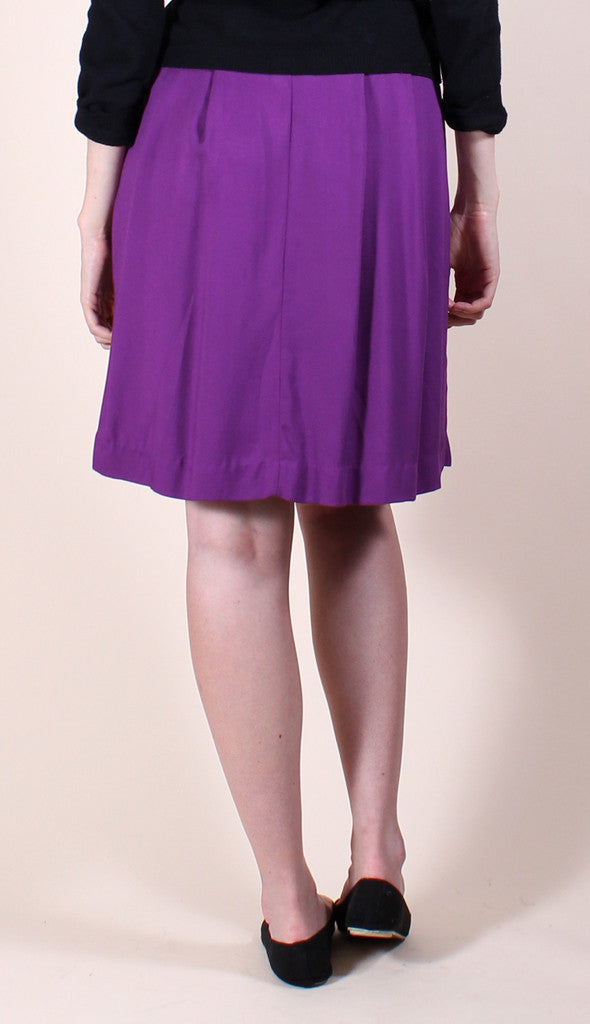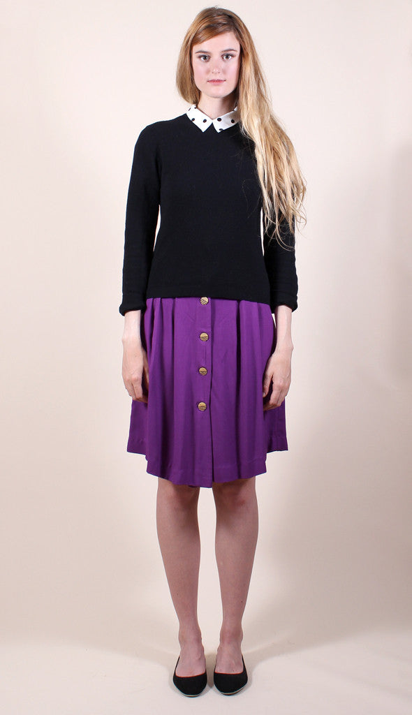 This sweet vintage-inspired A line skirt features striped wooden buttons against a rich purple. High waisted fit, midi-length. Skirt is unlined.