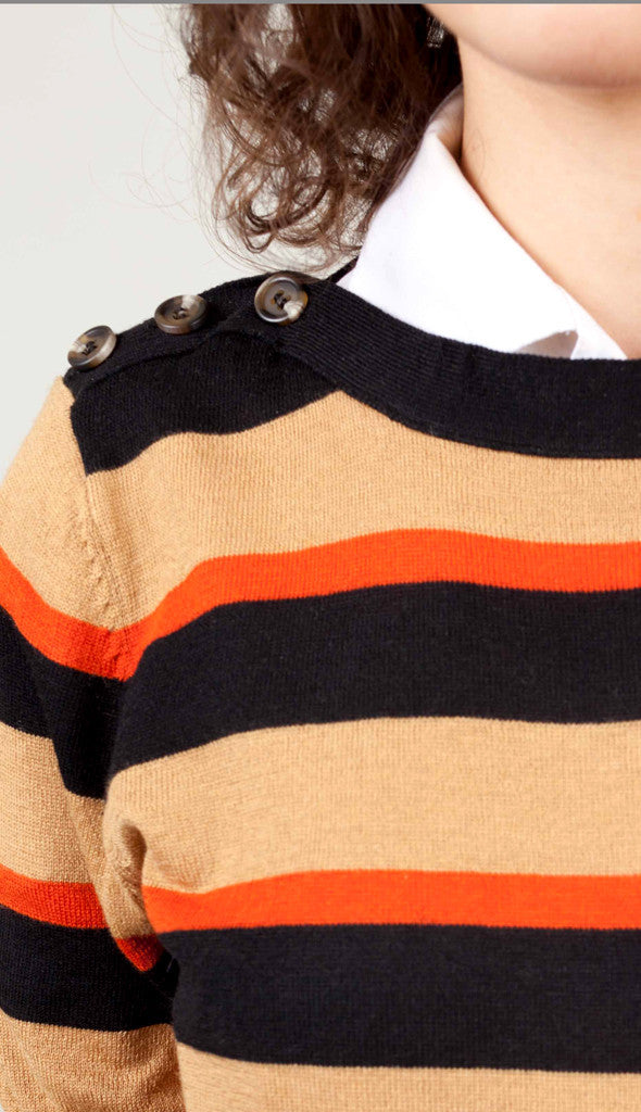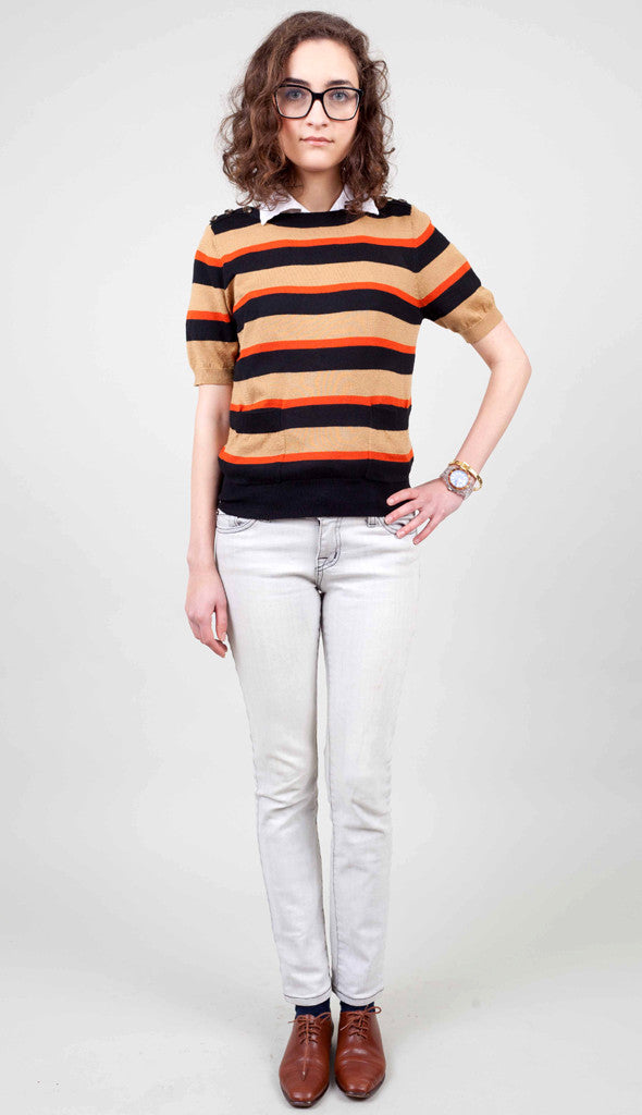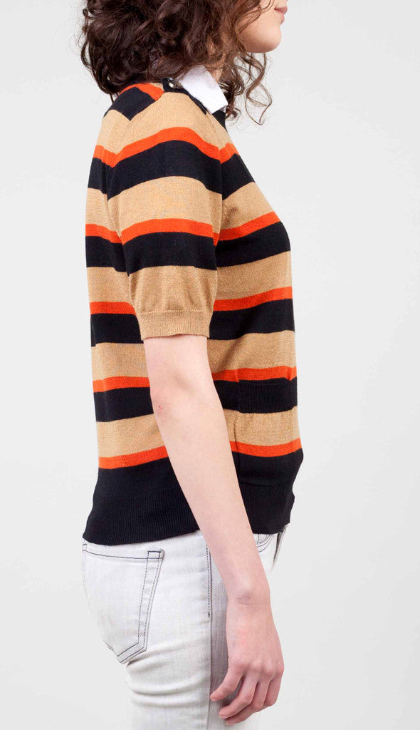 Half sleeve top striped in black, camel, and orange. Features tortoise buttons at shoulders and pockets at waist.