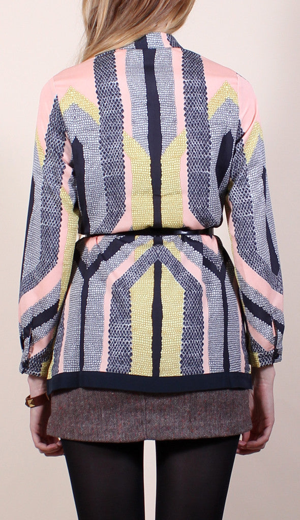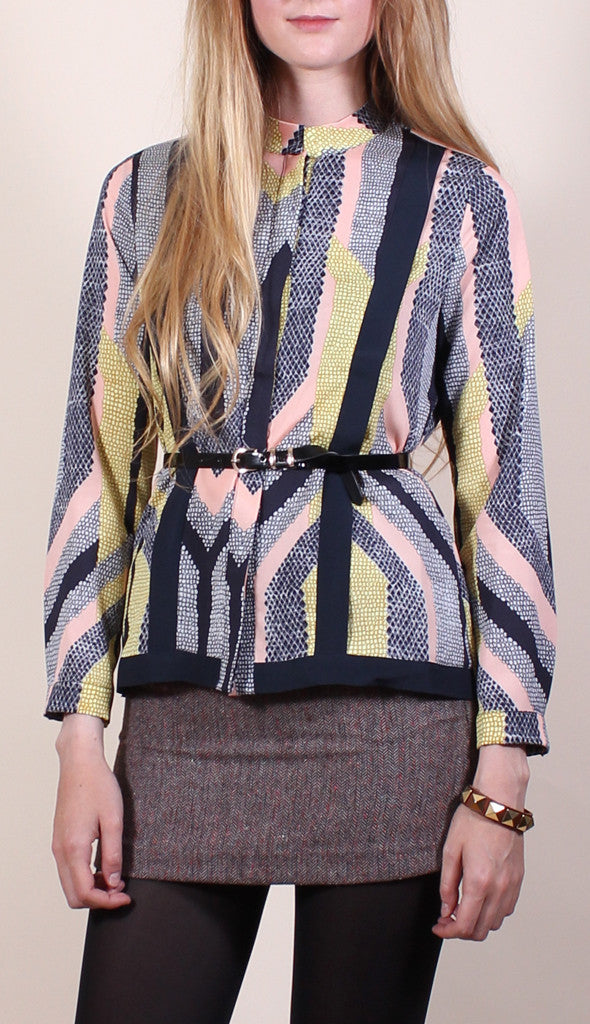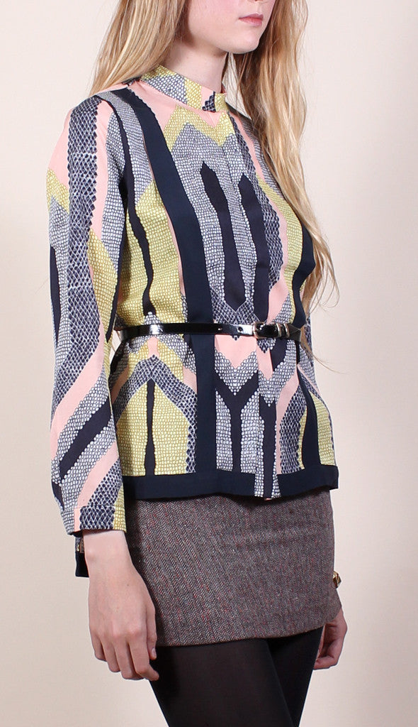 Collective ConceptsSilky blouse in an abstract snakeskin print. Features hidden button placket, long sleeves with button cuffs, high-low hemline and contrasting dark blue panels at front and hemline.