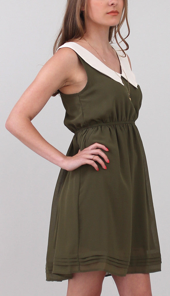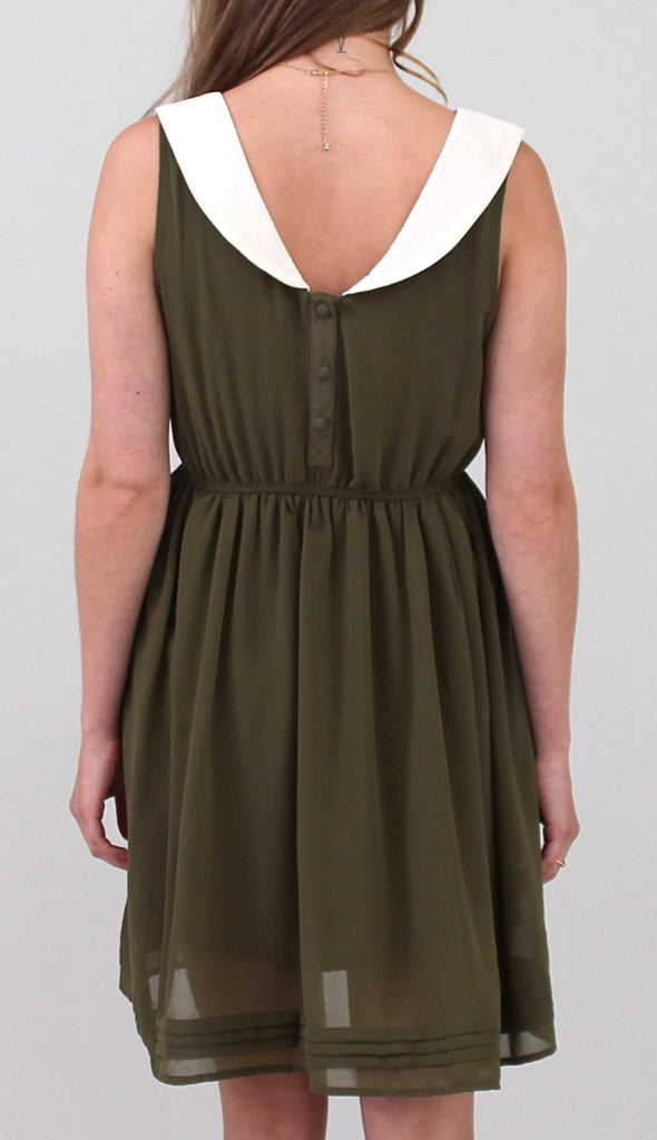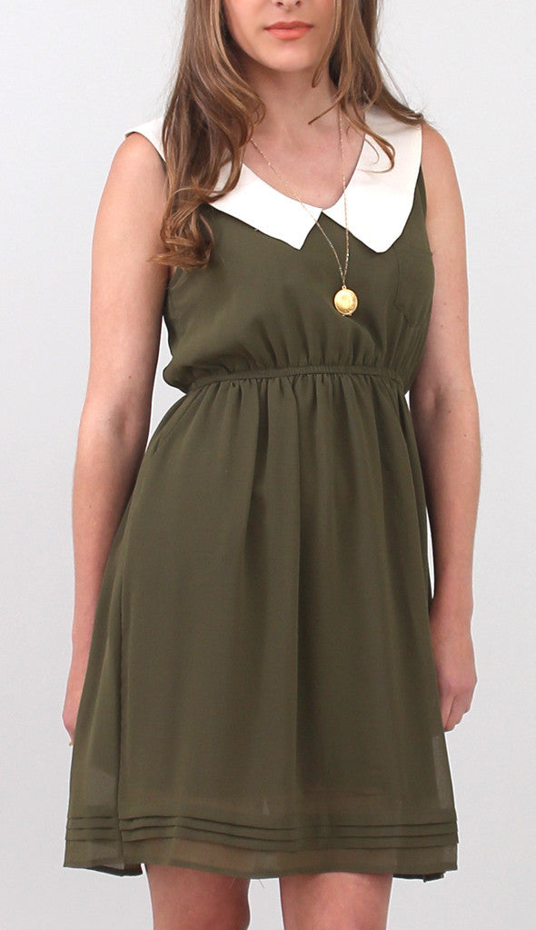 ImportedSuper easy sleeveless dress featuring a white pilgrim collar against army green chiffon. Small pocket on front left breast, buttons down the back, and pleating detail along the hemline of the skirt. Fully lined.