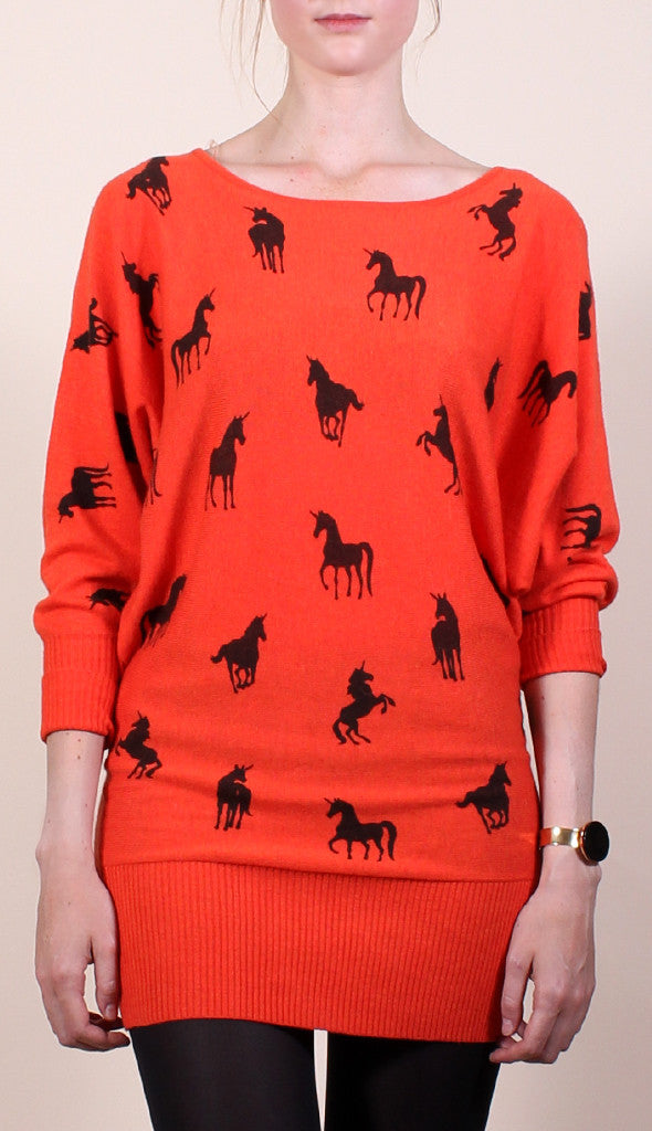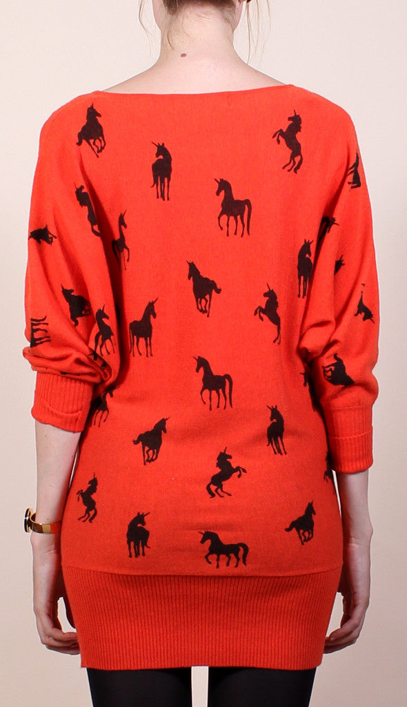 ImportedOrange knit sweater dress printed with a playful black unicorn pattern. Dolman sleeves with ribbed cuffs and hemline. Boat neckline. Can be worn as a dress or slouchy sweater. Unlined.