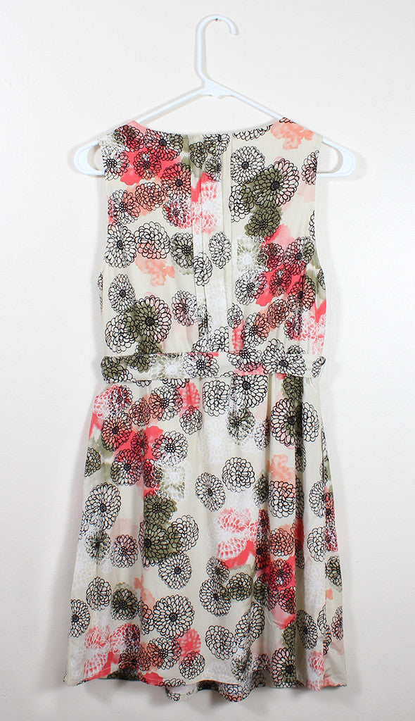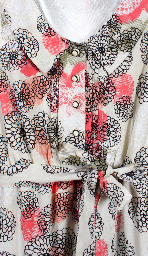 Vintage-inspired floral dress features collar, self tie and waist, front button placket, and side pockets and