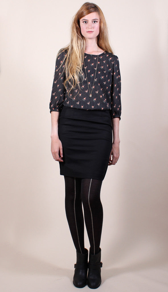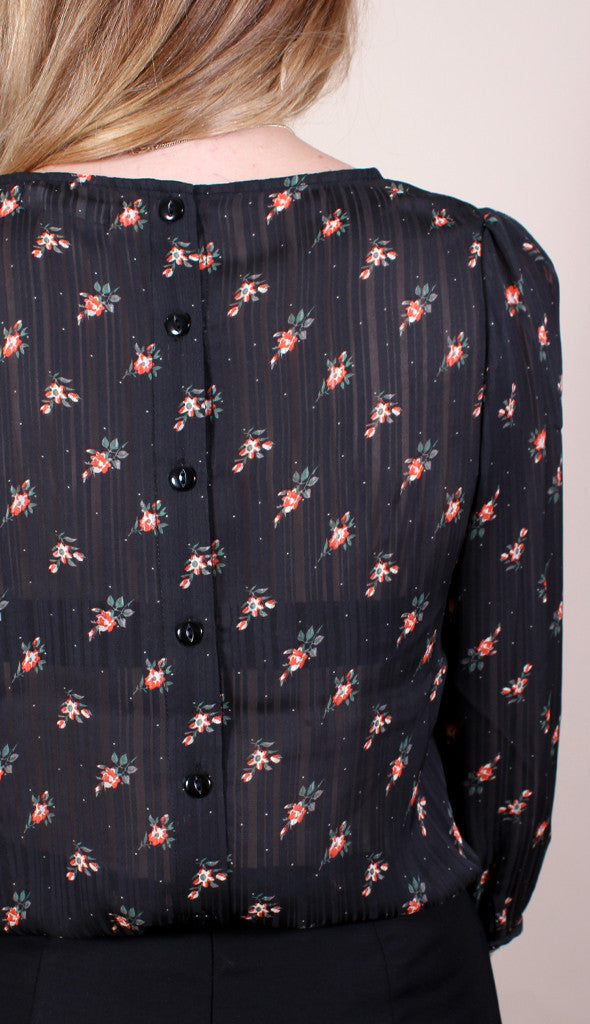TulleSemi-sheer top in a dark navy chiffon with sheer stripes and floral motif. Features 3/4 sleeves and buttons all the way down the back. Unlined.