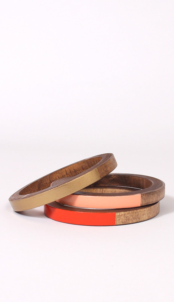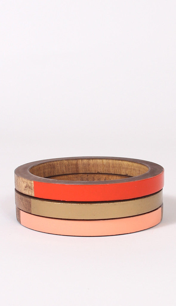 Voz ClothingA set of three skinny bangles by Voz Clothing painted with bands of color in orange, peach and gold. Each bangle has been stained a walnut color and will be finished with a clear gloss to ensure durability.