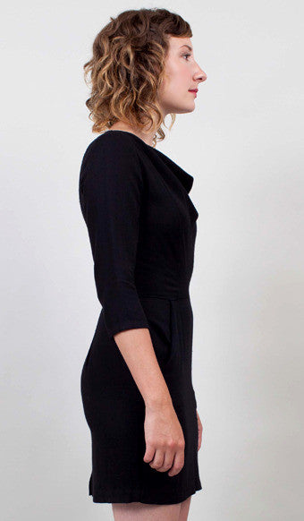 Perfect little black dress features cowl neckline, 3/4 sleeves, and a gathered waist with drop pockets. Zips in back.