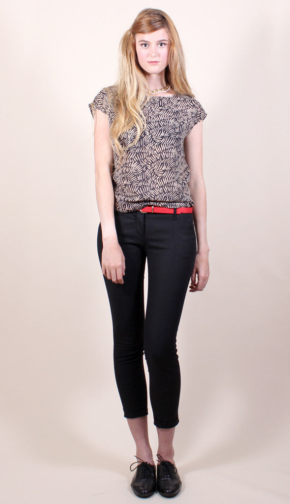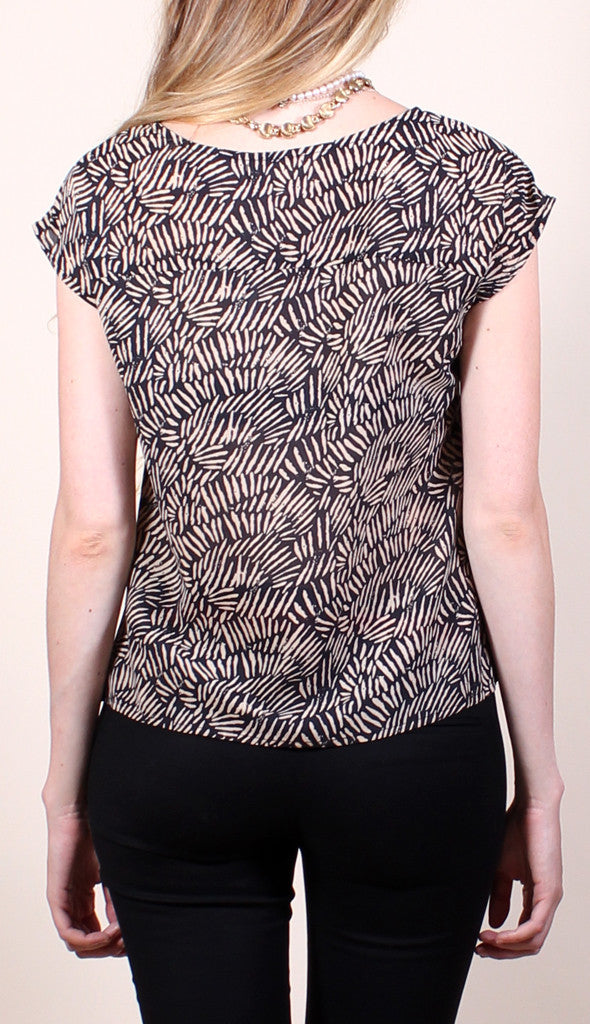 Limited-edition printed blouse by Tulle featuring a billowy silhouette and buttons at the shoulders. Light-weight, looks great tucked in or out. Unlined.