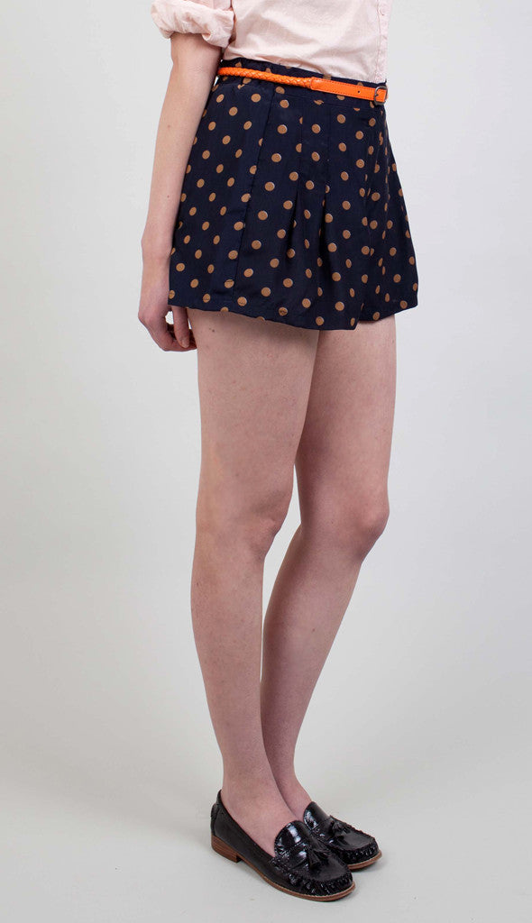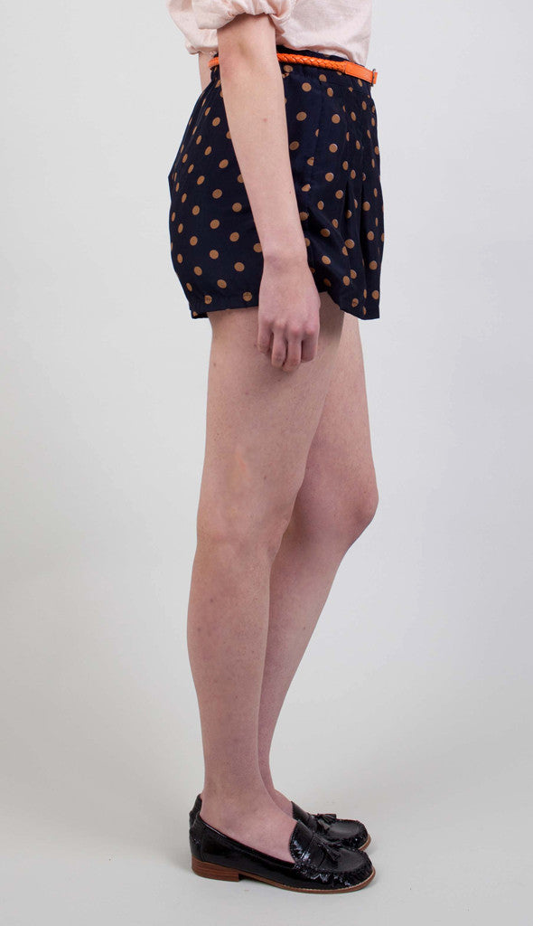 Flouncy tap shorts in silky navy blue and tan polka dot print. Features high waist and pleated front. Front zip and button closure.