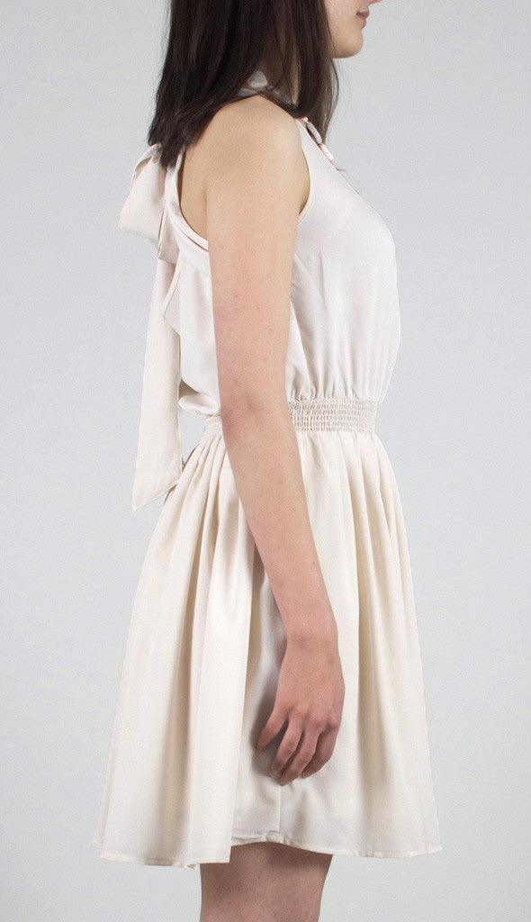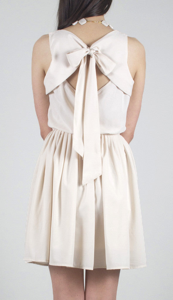 ImportedThis sweet ivory chiffon dress features an open back with a self-tying bow. The breezy sleeveless dress also features a scoop neckline with buttons down the bust and a smocked waist.