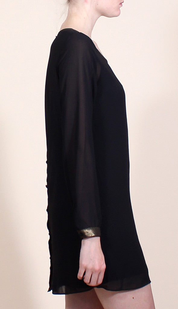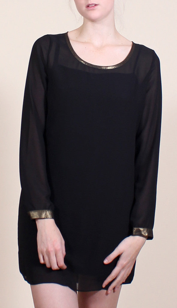 Olive and OakLong sleeve shift dress with olive green metallic trim at cuffs, neckline and down the back, including covered buttons. Sheer dress, includes cami slip that snaps to shoulders.