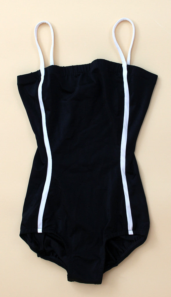 An 80's era Bill Blass one piece bathing suit in a classic shape with white straps that line the front. Swimsuit is unlined. All vintage items are final sale and can not be returned or exchanged.