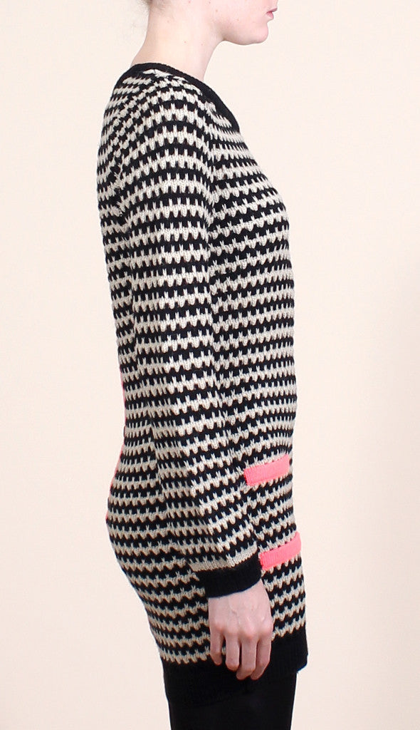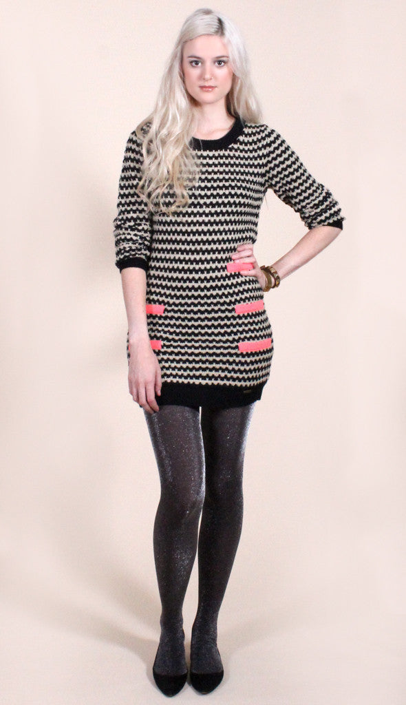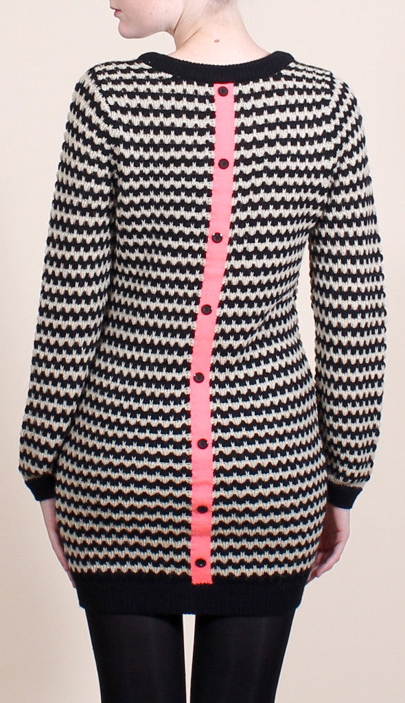 NümphCozy sweater dress in a black and white stripe knit by Numph Clothing. Features neon pink panels at front, and a stripe of neon pink down the back lined with buttons. Can be worn as a dress or oversized sweater with your favorite pair of leggings.