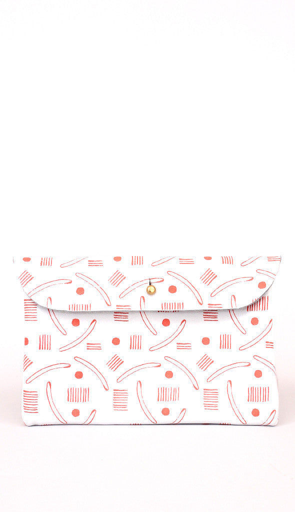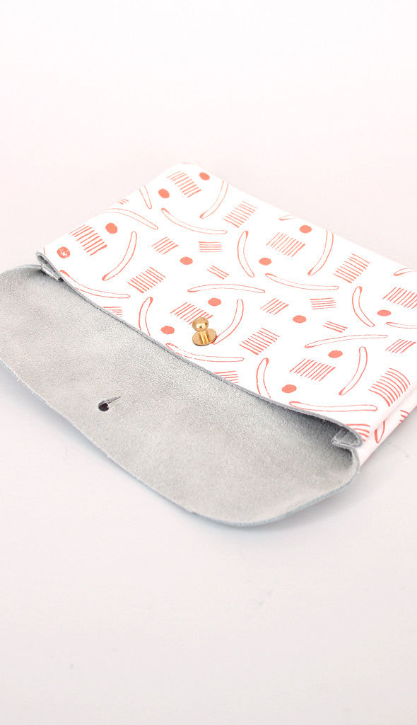 FalconwrightHandmade white leather wallet pouch from Falconwright screenprinted with a coral party mix pattern. Unlined suede interior, tab button closure.
