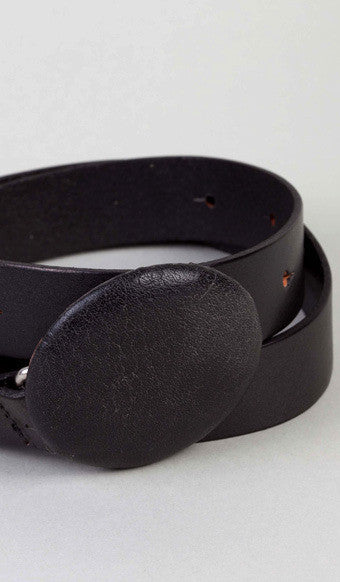 Black leather belt finished with an insulated leather-wrapped buckle.