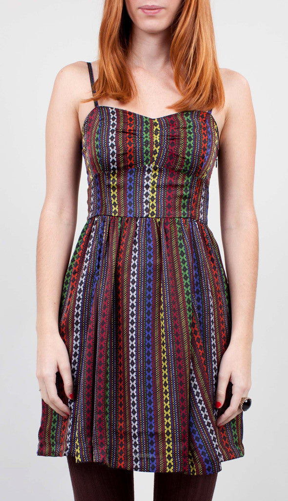 Jack by BB DakotaTapestry stripe printed charmeuse dress with spaghetti straps, a ruched bodice and circle skirt.