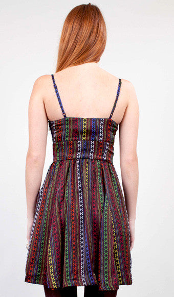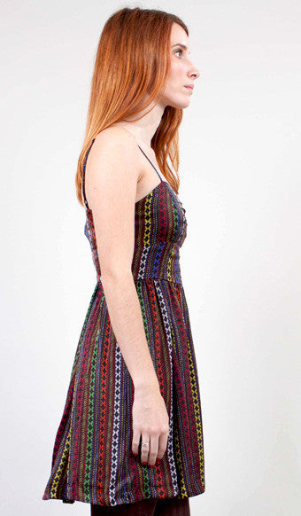 Tapestry stripe printed charmeuse dress with spaghetti straps, a ruched bodice and circle skirt.