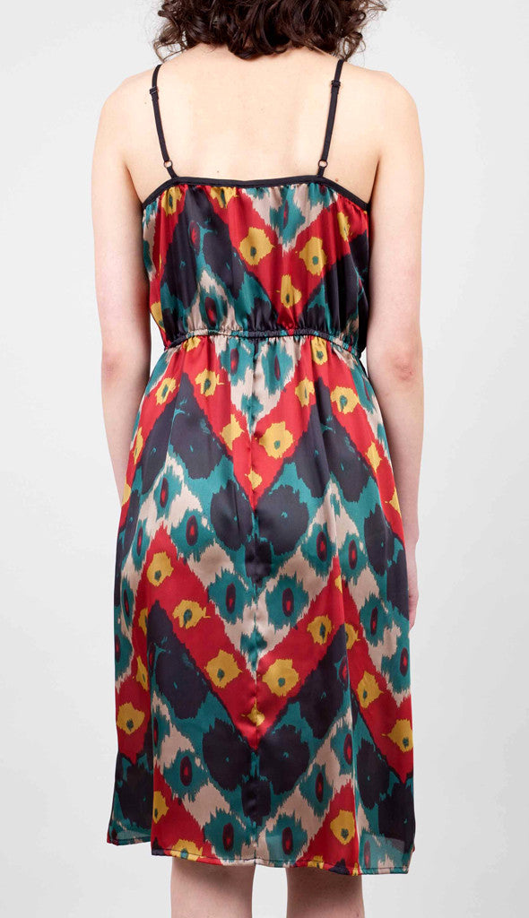 Silky spaghetti strap dress in an oversized ikat print. Features bustier detail edged in black. Adjustable straps and elastic waist.