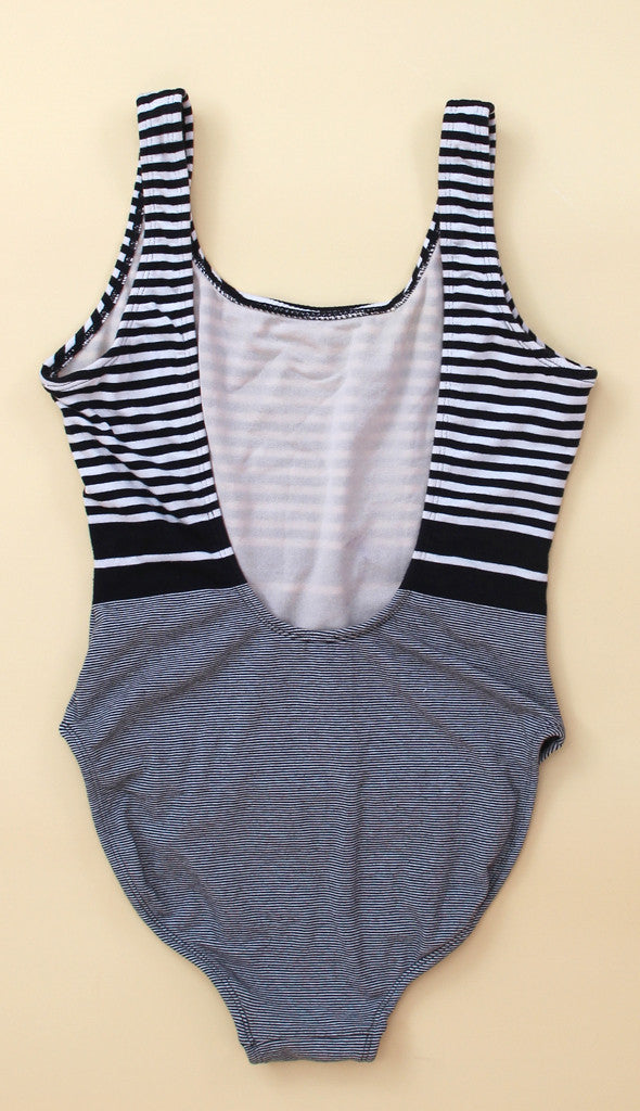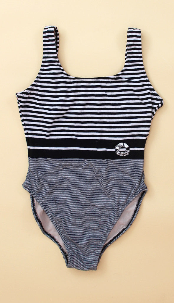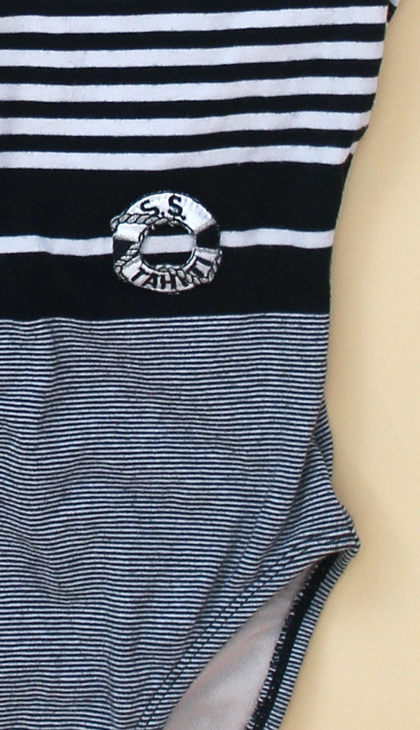 Black and white gradient striped vintage one piece embellished with an embroidered life preserver at the waist. Scooped neckline and deep scoop back, with French cut bottom. Fully lined. All vintage items are final sale and can not be returned or exchanged.