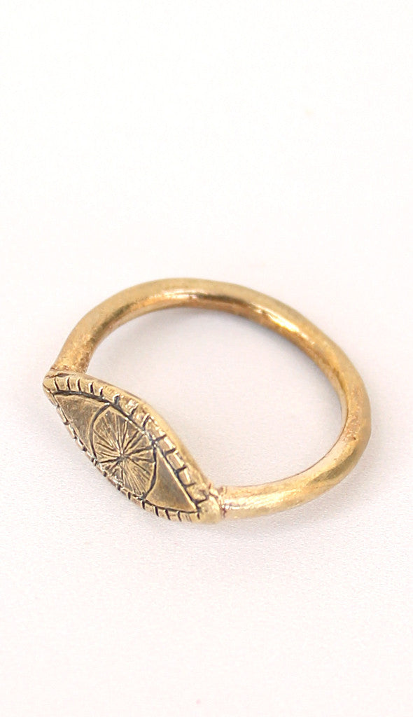 A dainty brass eye ring cast from hand carved wax by Datter. Eye sits flat on the top of your finger with a round band. Gold-toned brass.