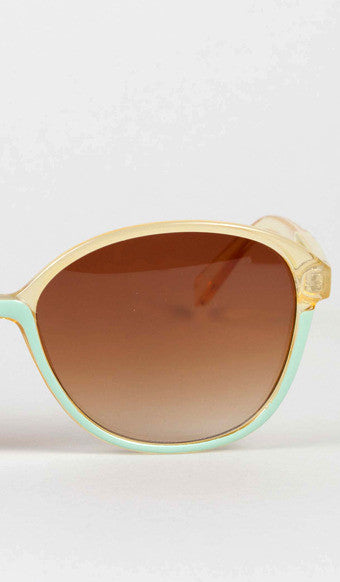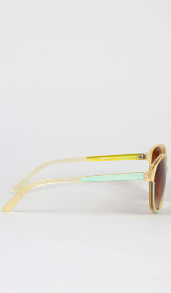 Lemon-yellow transparent frames with an opaque sea foam accent. Brown-tinted lenses. UV protection.